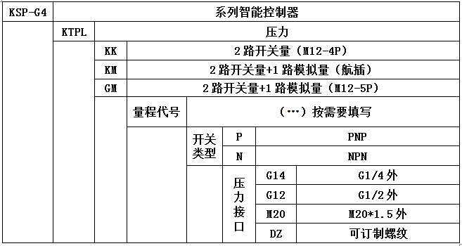 KSP-G4系列智能控制器是集壓力、溫度、液位的測量、顯示與控制為一體的智能開關。該產品為全電子結構,前端采用進口高精度傳感器,輸出信號由高精度、低溫漂的放大器放大處理,送入高精度的A/D轉換器,轉換成微處理器適用的數字信號,通過數字信號對控制系統壓力進行測控及開關控制。
