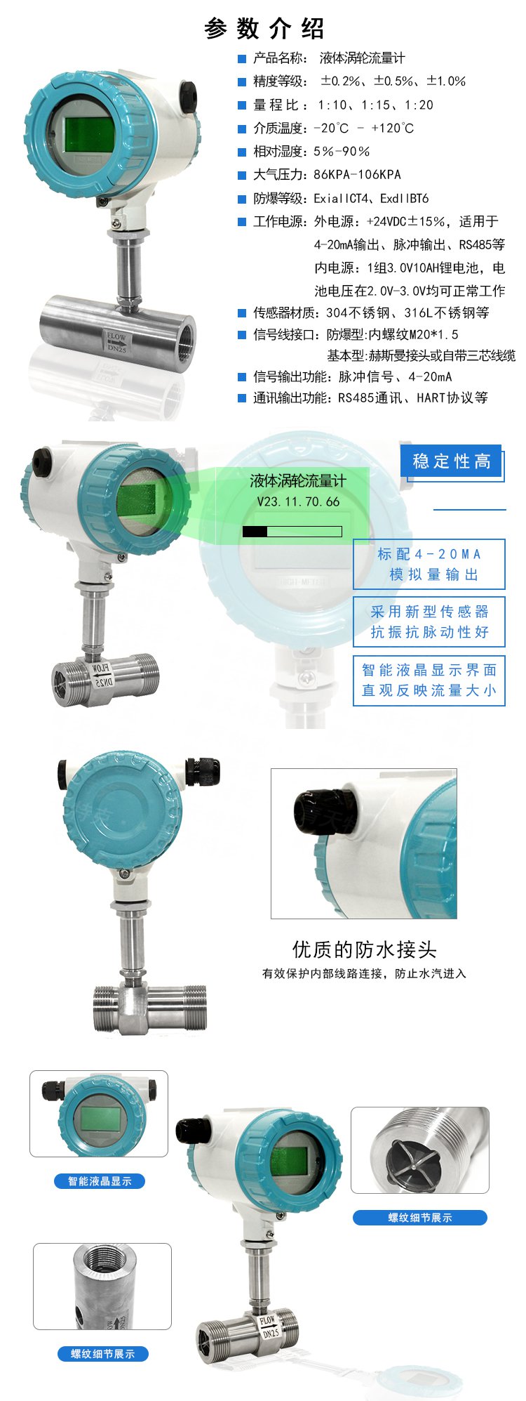 流體流經傳感器殼體,由于葉輪的葉片與流向有一定的角度,流體的沖力使葉片具有轉動力矩,克服摩擦力矩和流體阻力之后葉片旋轉,在力矩平衡后轉速穩定,在一定的條件下,轉速與流速成正比,由于葉片有導磁性,它處于信號檢測器(由永久磁鋼和線圈組成)的磁場中,旋轉的葉片切割磁力線,周期性的改變著線圈的磁通量,從而使線圈兩端感應出電脈沖信號,此信號經過放大器的放大整形,形成有一定幅度的連續的矩形脈沖波,可遠傳至顯示儀表,顯示出流體的瞬時流量和累計量。在一定的流量范圍內,脈沖頻率f與流經傳感器的流體的瞬時流量Q成正比,流量方程為:Q=3600×f/k